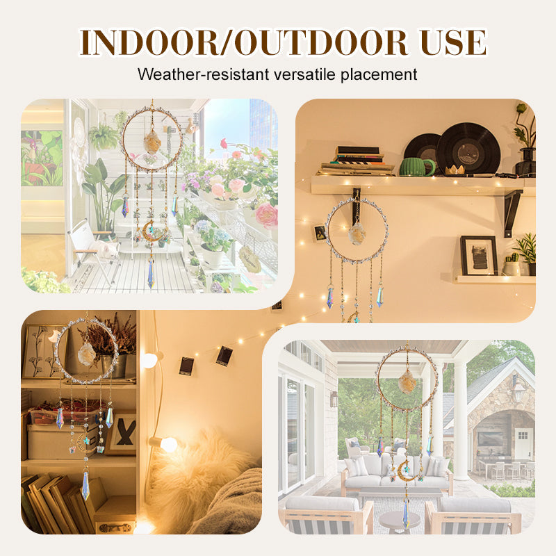 DYNAMICZNE ZAŁAMANIE TĘCZY - Opalizujące kawałki szkła przechwytują światło słoneczne, tworząc tańczące wzory pryzmatyczne. Każdy element działa jak miniaturowy pryzmat, przekształcając przestrzenie za pomocą spektralnych pokazów świetlnych, które ewoluują w ciągu dnia, tworząc magiczne efekty wizualne.