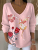 Damski diamentowy ptak i róża haftowane różowy sweter z dekoltem w szpic