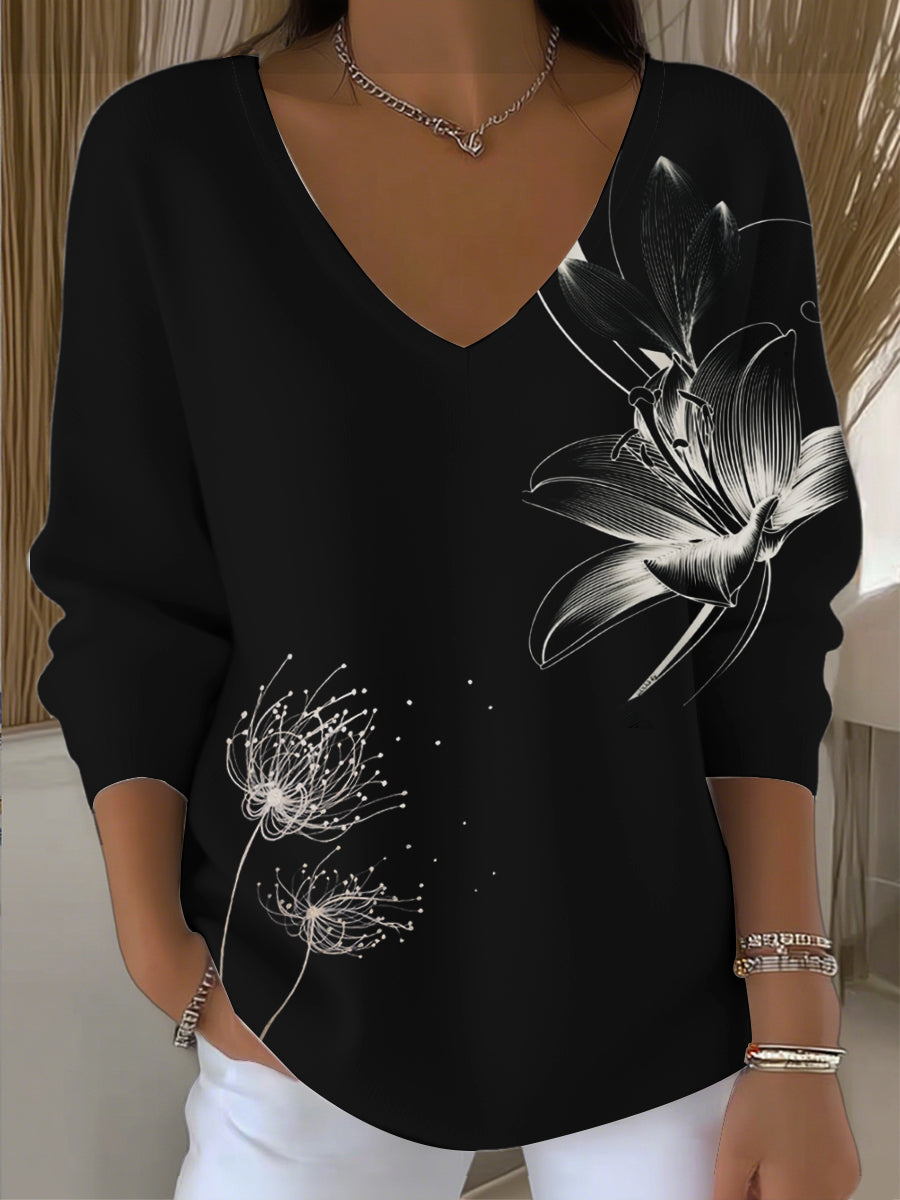 Damski prosty i elegancki kwiatowy haft czarny sweter z dekoltem w szpic