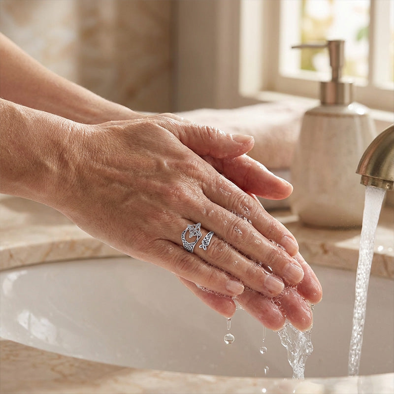 Praktyczny, otwarty design umożliwia delikatną regulację rozmiaru, dzięki czemu pierścionek dopasowuje się do większości palców bez potrzeby dokładnego mierzenia.