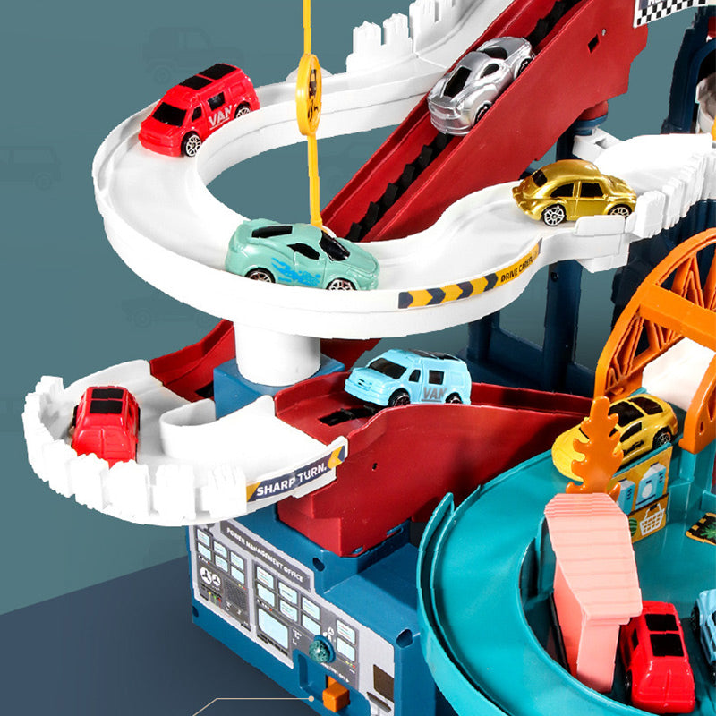 ELEKTRYCZNY SYSTEM TRANSPORTOWY – Dzięki wbudowanemu elektrycznemu systemowi transportowemu zabawka ta umożliwia samochodzikom płynną jazdę po zboczu, tworząc nieprzerwaną pętlę emocji.