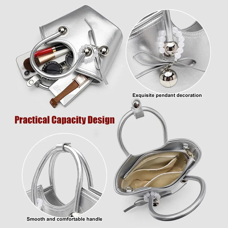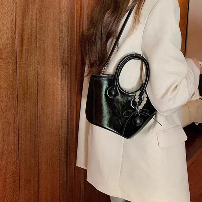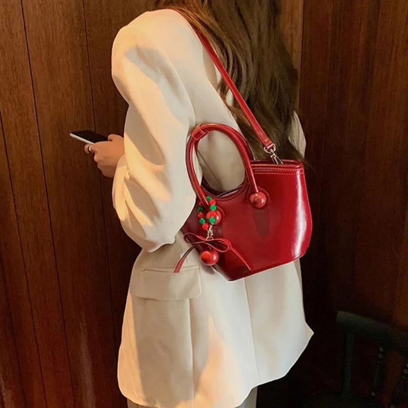 ELEGANCKI DETAL W POSTACI WISIENKI: Torebka posiada elegancką zawieszkę w kształcie wisienki, która dodaje wyjątkowego, zabawnego akcentu, czyniąc ją wyróżniającym się dodatkiem, który podniesie każdy strój swoim kapryśnym urokiem.