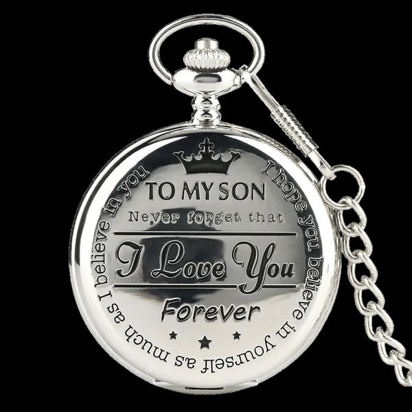 Przypomnij swojemu synowi, jak bardzo go kochasz dzięki temu pięknemu zegarkowi kieszonkowemu z grawerem laserowym. Ten zegarek kieszonkowy to idealny prezent, który z pewnością doceni i będzie cenił. Dzięki temu przemyślanemu, grawerowanemu przypomnieniu na zawsze będzie nosił przy sobie Twoją miłość…