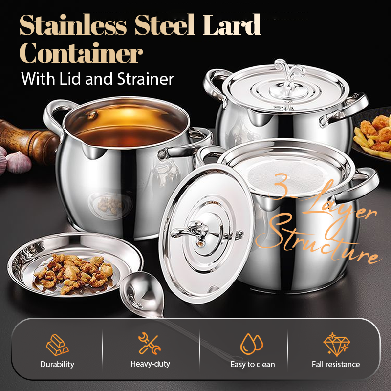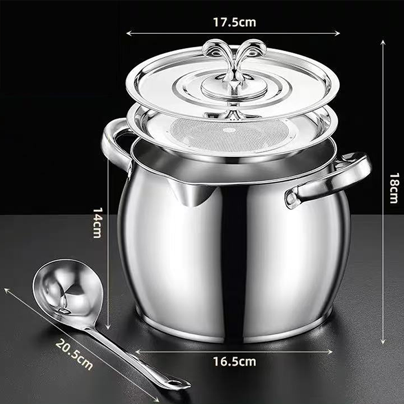 SKUTECZNE ODDZIELANIE RESZTEK OLEJU: Zaprojektowany z grubego korpusu ze stali nierdzewnej i drobnego sitka, ten pojemnik na smalec zapewnia dokładną filtrację oleju. Skutecznie oddziela resztki oleju podczas i po wytapianiu, zapewniając czysty, nieskażony smalec przy minimalnym wysiłku.