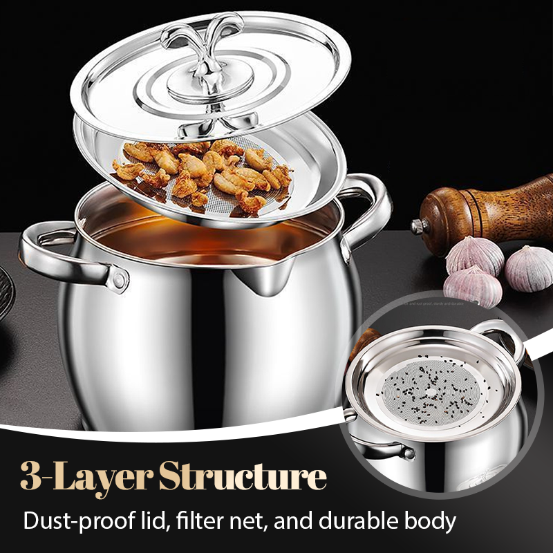 3-WARSTWOWA KONSTRUKCJA: Trzyczęściowa konstrukcja obejmuje pyłoszczelną pokrywę, wbudowane sitko i gruby korpus garnka ze stali nierdzewnej. Zapewnia to higienę, skuteczne filtrowanie i trwałość w wysokich temperaturach.
