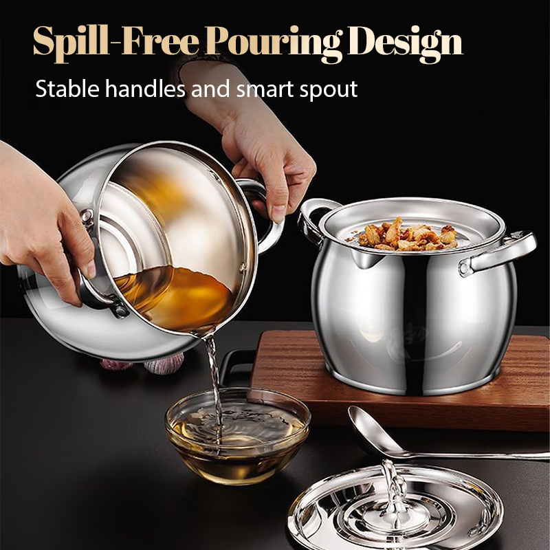SZEROKI OTWÓR: Szeroki otwór ułatwia dostęp do zestalonego smalcu lub płynne nalewanie gorącego oleju. Koniec z problemami z wąskimi otworami — idealny do codziennego użytku w kuchni, niezależnie od tego, czy przechowujesz olej, czy podajesz zupę.