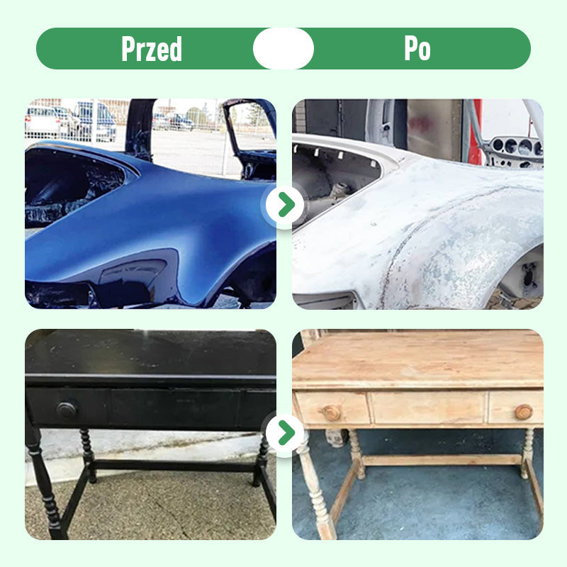 BEZPIECZNY DLA WSZYSTKICH POWIERZCHNI – W przeciwieństwie do metod ściernych, ten środek do usuwania można bezpiecznie stosować na różnych powierzchniach – metalowych, plastikowych i drewnianych. Skutecznie usuwa farbę, jednocześnie chroniąc strukturę oryginalnego materiału. Idealny zarówno do renowacji mebli, jak i detali samochodowych.