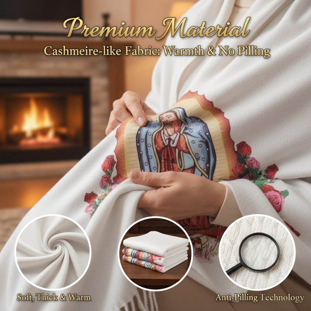 Każdy szal ma piękny wzór przedstawiający Matkę Boską, symbolizujący pokój, nadzieję i boską ochronę. To nie tylko dodatek — to codzienne przypomnienie o wierze i wdzięczności w tym świętym okresie.