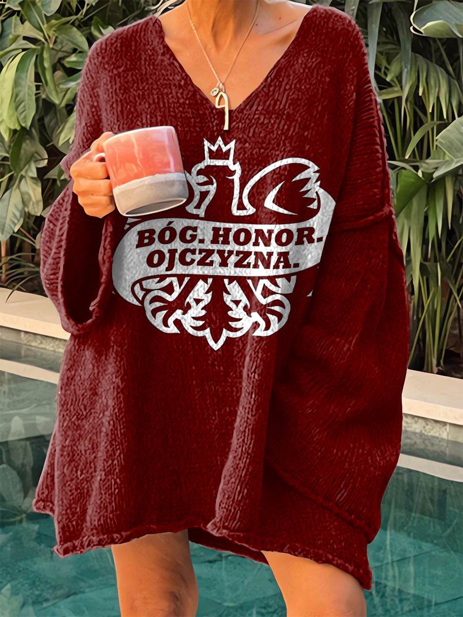 Damski sweter z dekoltem w serek i nadrukiem w stylu retro